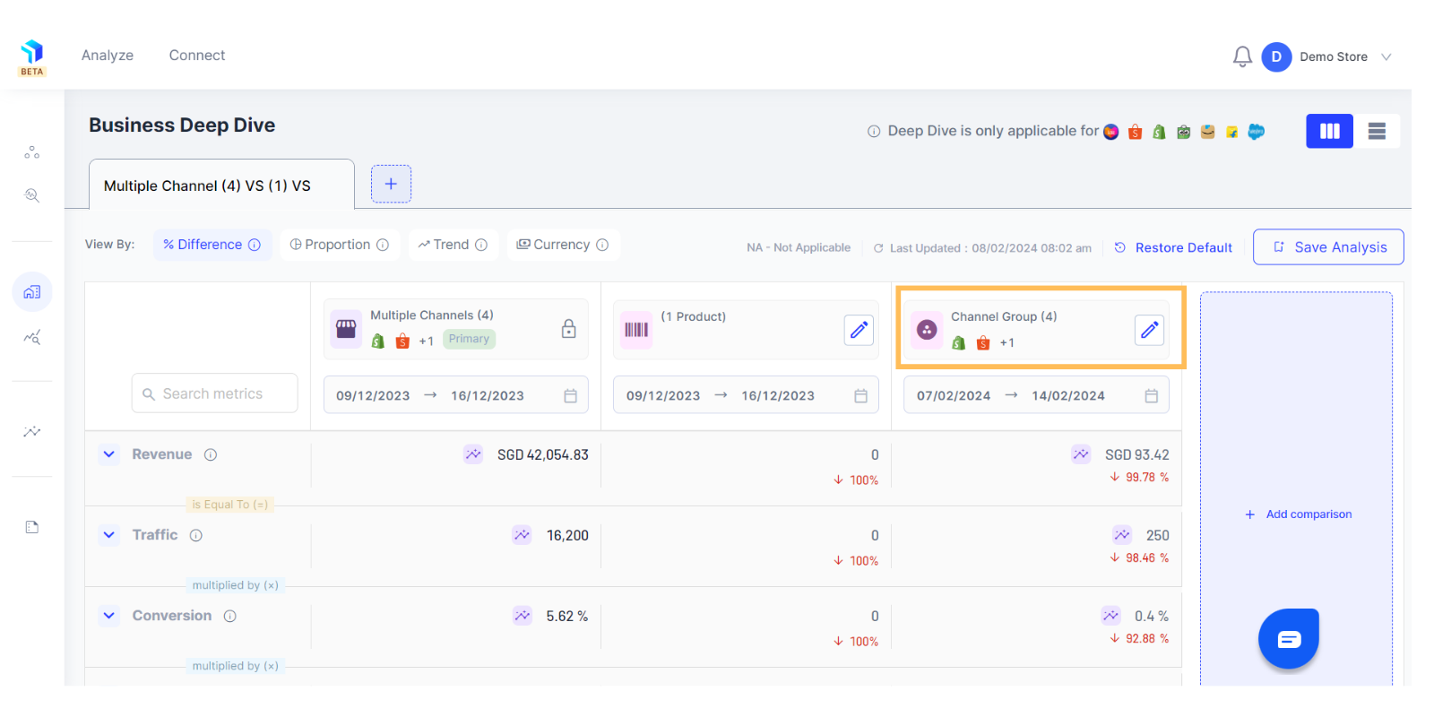 - Anda dapat menambahkan lebih banyak kolom untuk membandingkan metrik bisnis. Kolom utama (default) menampilkan nilai dari semua toko.