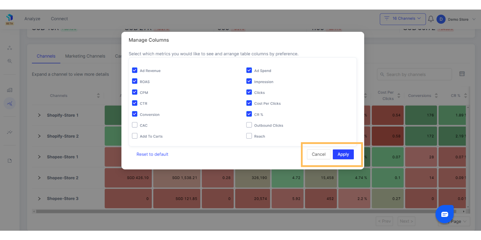 5. Kelola metrik yang ditampilkan di tabel dengan ikon kolom-tabel di kanan atas halaman di sebelah bilah pencarian dan pilih metrik yang sesuai dengan bisnis Anda.