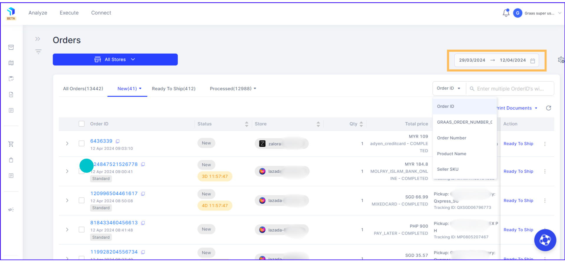 4. Anda dapat memilih rentang tanggal yang Anda inginkan untuk melihat pesanan dari semua toko yang terhubung.